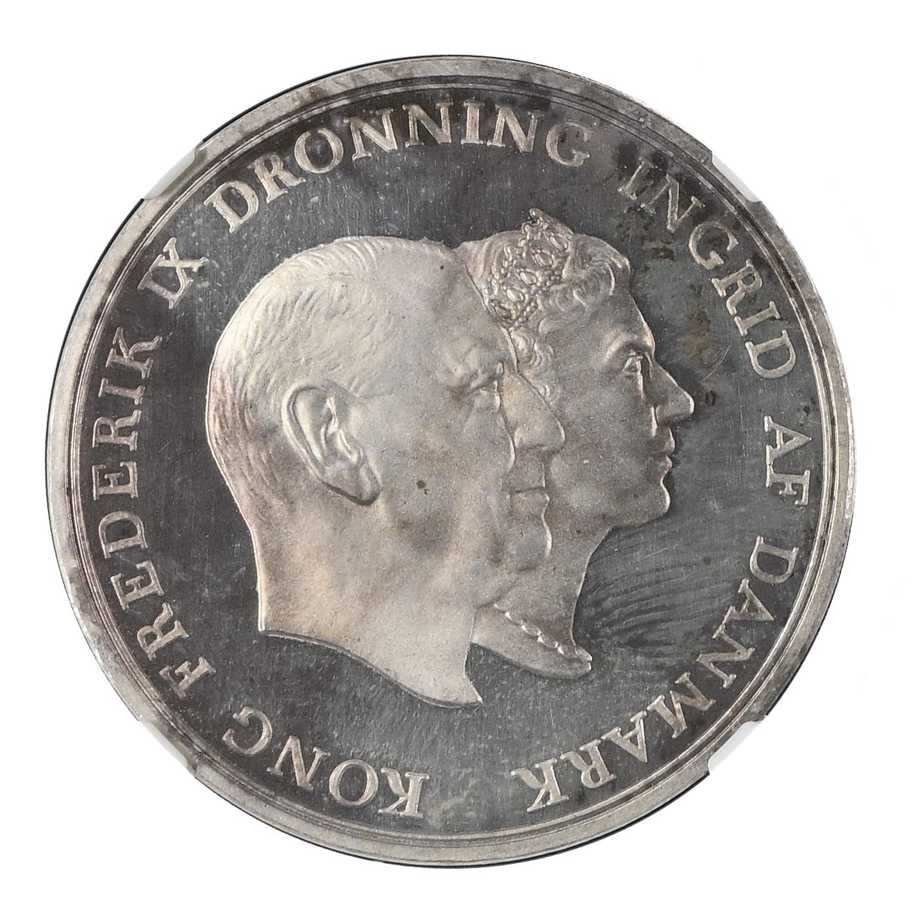 Опис: З'єднані голови короля Фредеріка IX та королеви Інгрід з їхніми іменами по краю монети.