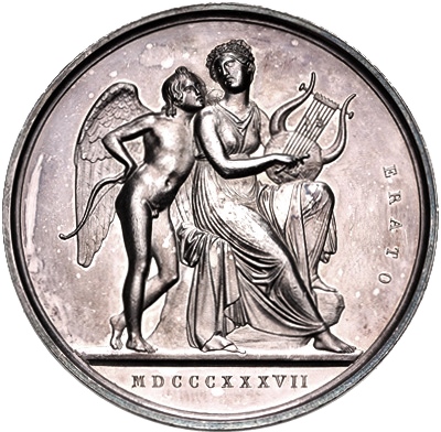 Опис: Відома мармурова статуя Торвальдсена: Ерата сидить праворуч, головою ліворуч, граючи на лірі; ліворуч — Купідон стоїть праворуч, тримаючи лук. Дата внизу, в ексергу.