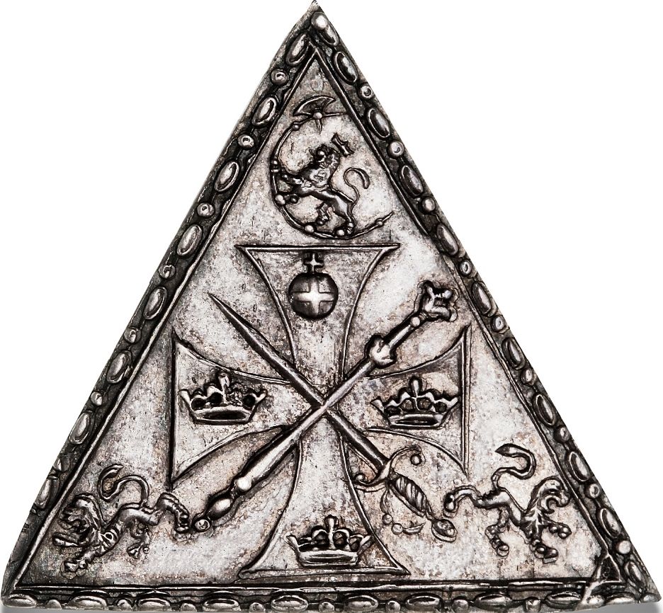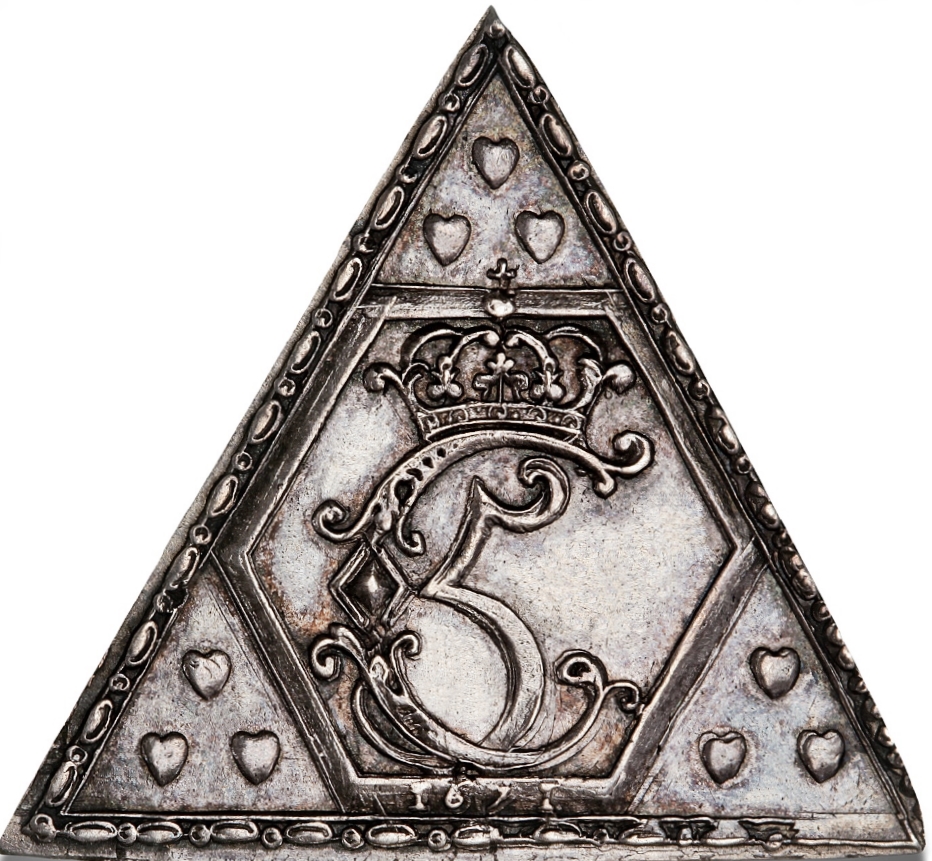 Опис: Монограма коронованого короля у шестикутнику, три серця у кожному зовнішньому куті. Дата у нижній частині шестикутника.