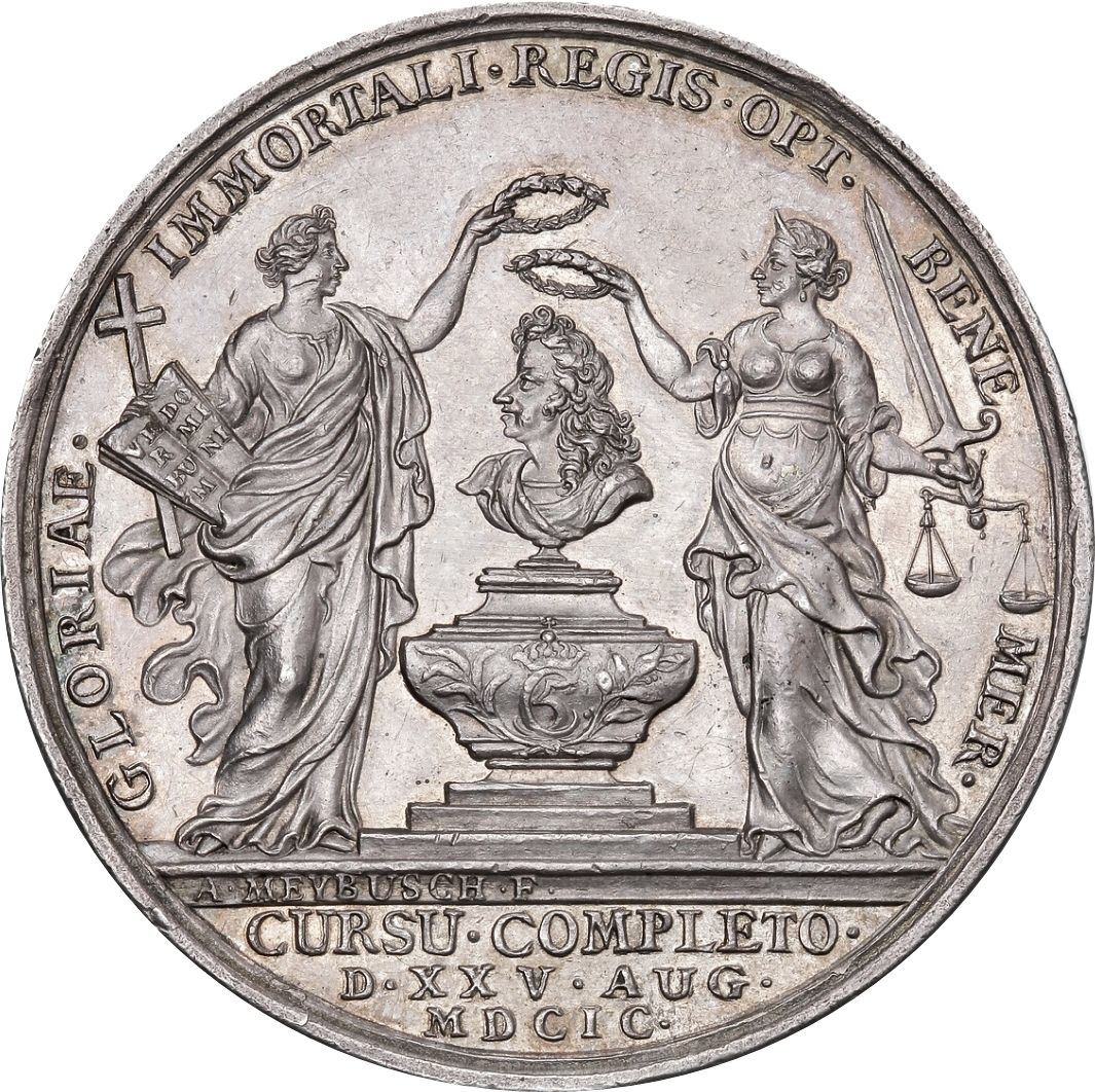Опис: Погруддя короля Крістіана V на п'єдесталі, прикрашеному гілками та монограмою короля, увінчане лавровим вінком двома стоячими завуальованими жіночими фігурами з боків: Побожність ліворуч та Справедливість праворуч (такі самі, як на медалі 1672 року). Нижче, в ексергу, ім'я гравера та дата смерті короля.