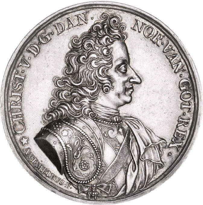 Опис: Бюст короля Крістіана V у обладунках та плащі з довгим кучерявим волоссям, звернений праворуч. На плечі королівських обладунків зображено квіткові орнаменти, а на поясі — підвіска Ордена Слона.