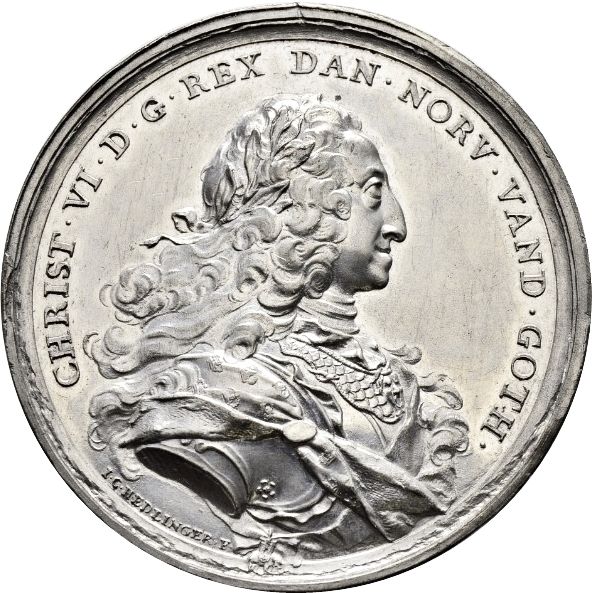 Опис: Погруддя короля Крістіана VI у повний зріст, звернене вправо, з лавровим вінком, обладунками та мантією з горностаю.