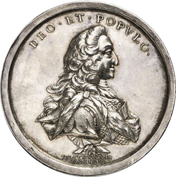 Опис: Покритий мантією та обладунками бюст короля Крістіана VI, звернений праворуч