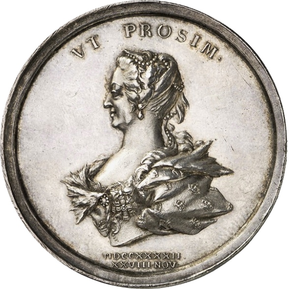 Опис: Бюст королеви Софії Магдалени, звернений ліворуч. Королева має перлове намисто у волоссі та одягнена в мантію й намисто «L'Union parfaite»