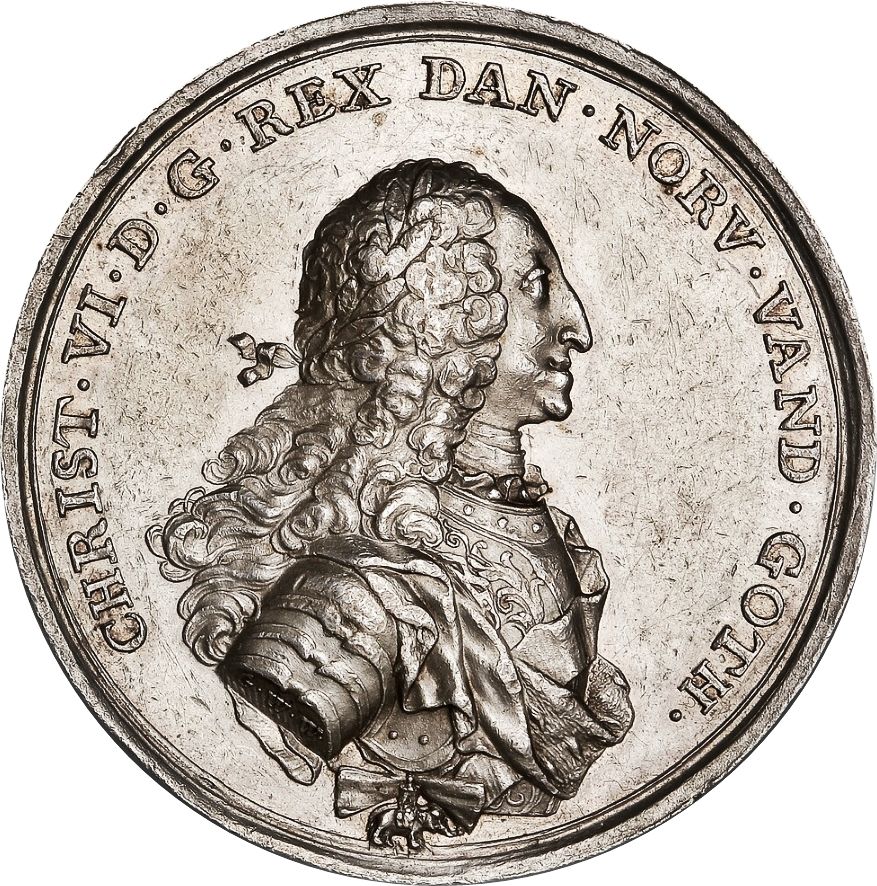 Опис: Броньований і в мантії напівпогруддя короля Крістіана VI, зверненого вправо.