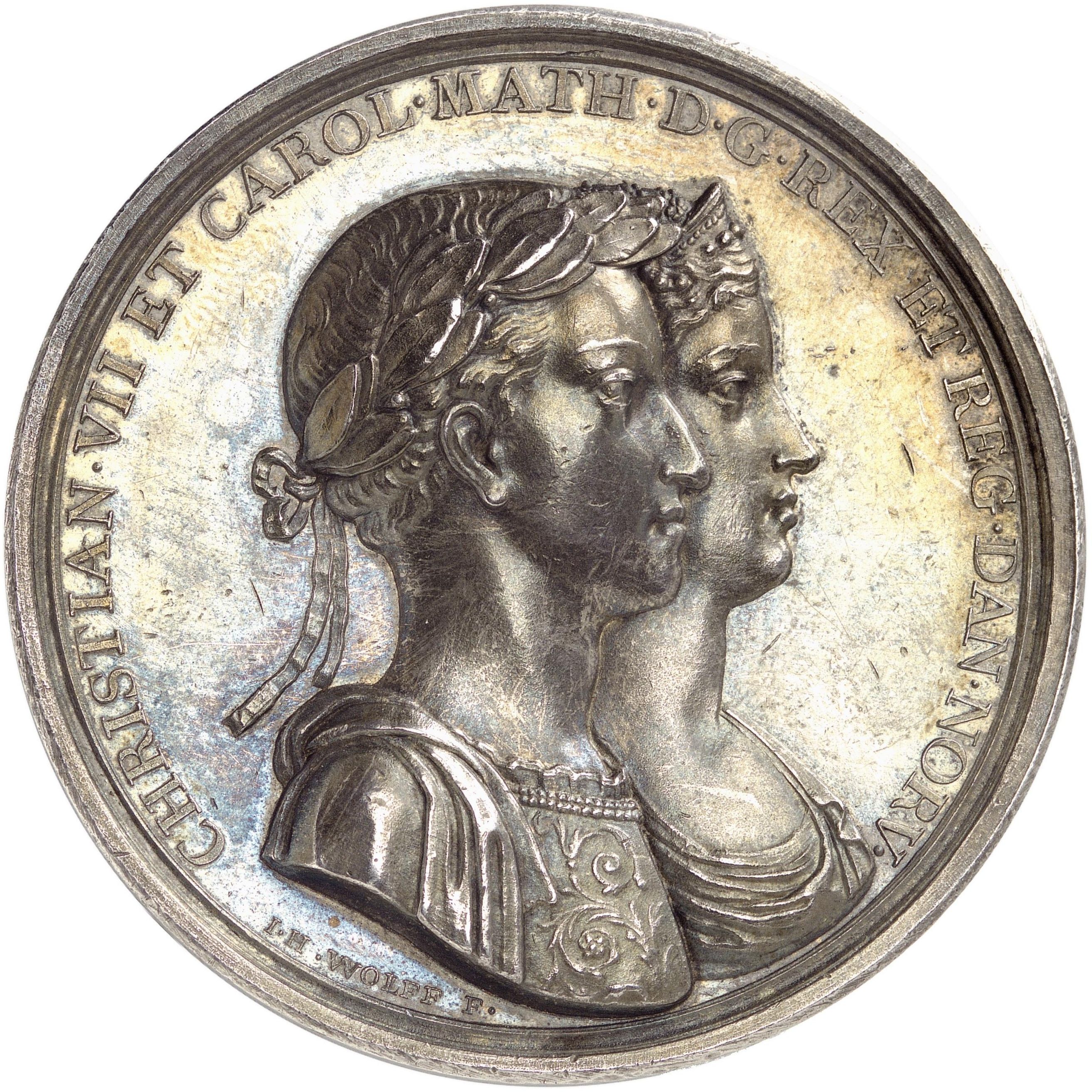 Опис: Лаврові подвійні бюсти Крістіана VII та Кароліни Матильди, звернені вправо. Навколо — напис, по краю — суцільне кільце.