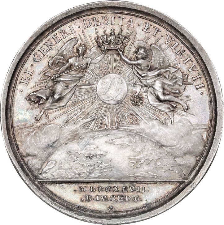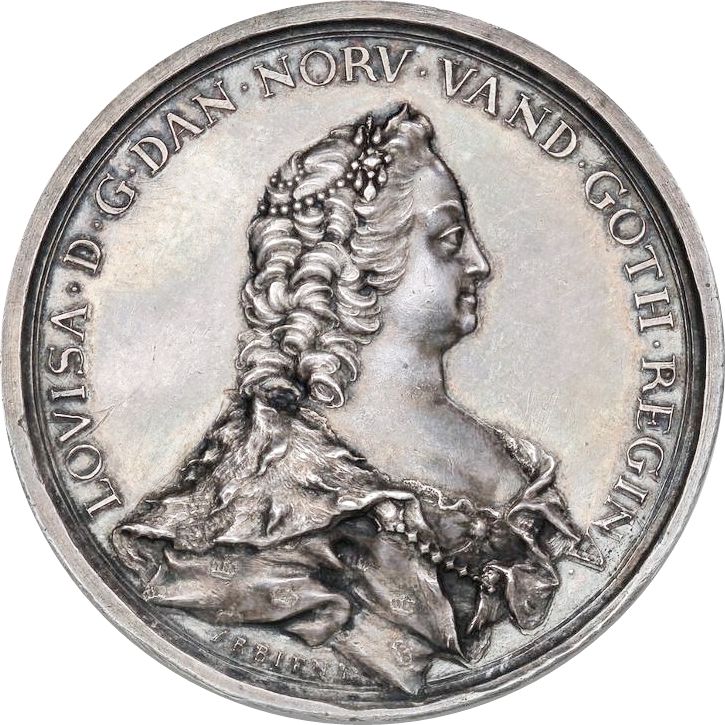 Опис: Два ангели тримають корону над сяючим дзеркальним монограмом королеви Луїзи. Нижче — півкуля Землі в хмарах з контурами Данії та Норвегії