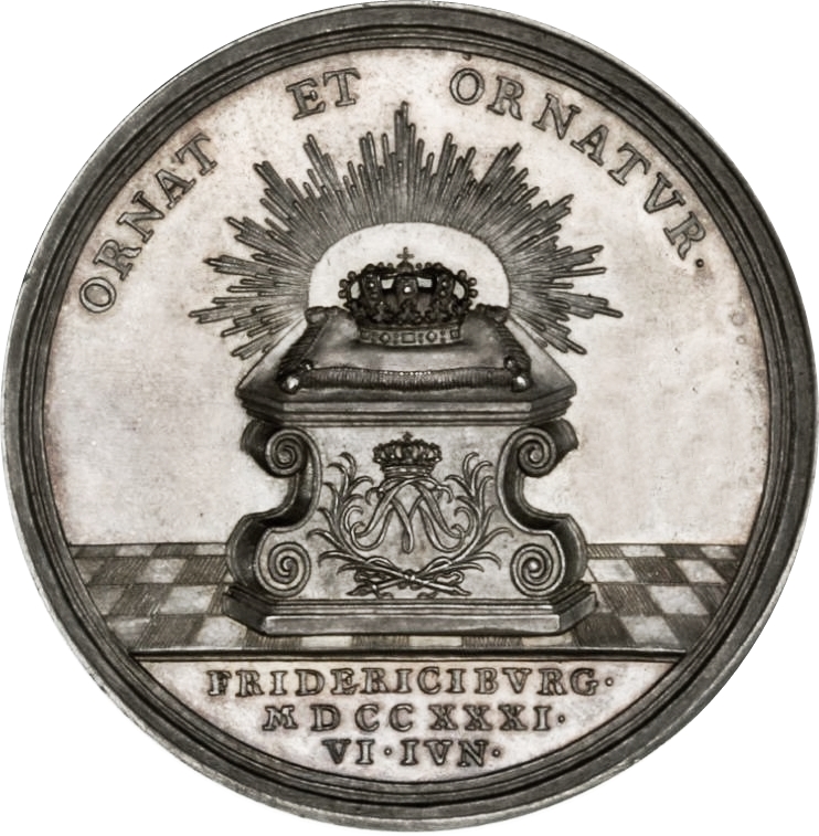 Опис: Промениста корона королеви Данії на подушці над невеликим вівтарем, прикрашеним монограмою Софії Магдалени. Місце та дата коронації вказані в ексергу нижче.