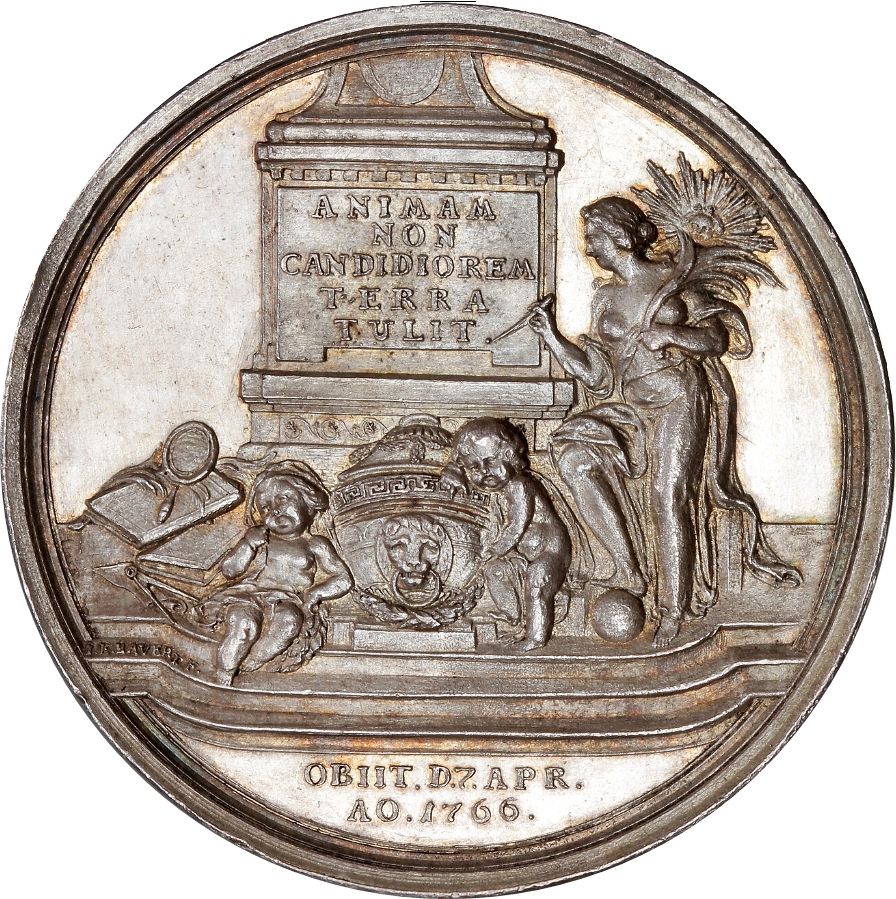 Опис: Жіноча фігура сидить напівгола перед сяючим сонцем, тримаючи в руках пальмову гілку. Правою рукою вона пише чотирирядковий напис на основі обеліска. Перед ним стоять два херувими, оточені атрибутами науки.