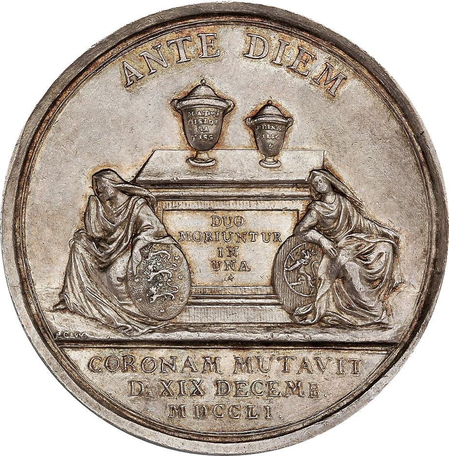 Опис: Дві лежачі та скорботні Данія та Норвегія зі своїми гербами (зображені у вигляді двох жінок у вуалі) знаходяться по боках гробниці з написом спереду та двома урнами на ній.