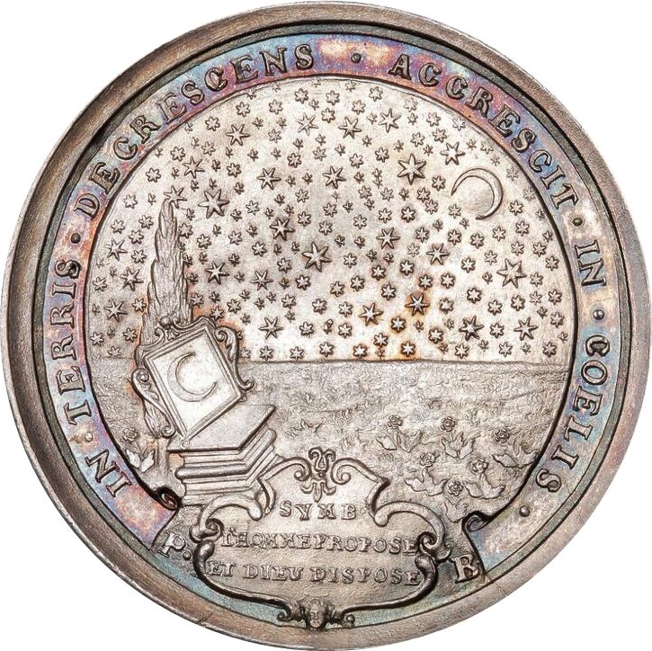 Опис: Зоряне небо з місяцем, що сходить; на землі — п’єдестал з оздобленим прямокутним дзеркалом, яке відбиває місяць. За п’єдесталом високий кипарис. На передньому плані картуш із трьома рядками тексту розділяє ініціали гравера з боків.