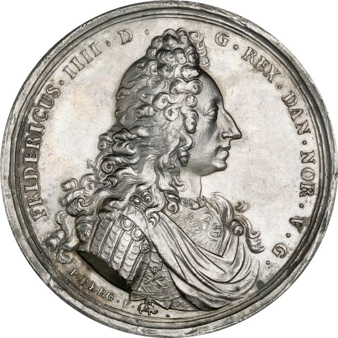 Опис: Бюст короля Фредеріка IV у обладунках та плащі, звернений праворуч, з довгим кучерявим волоссям.