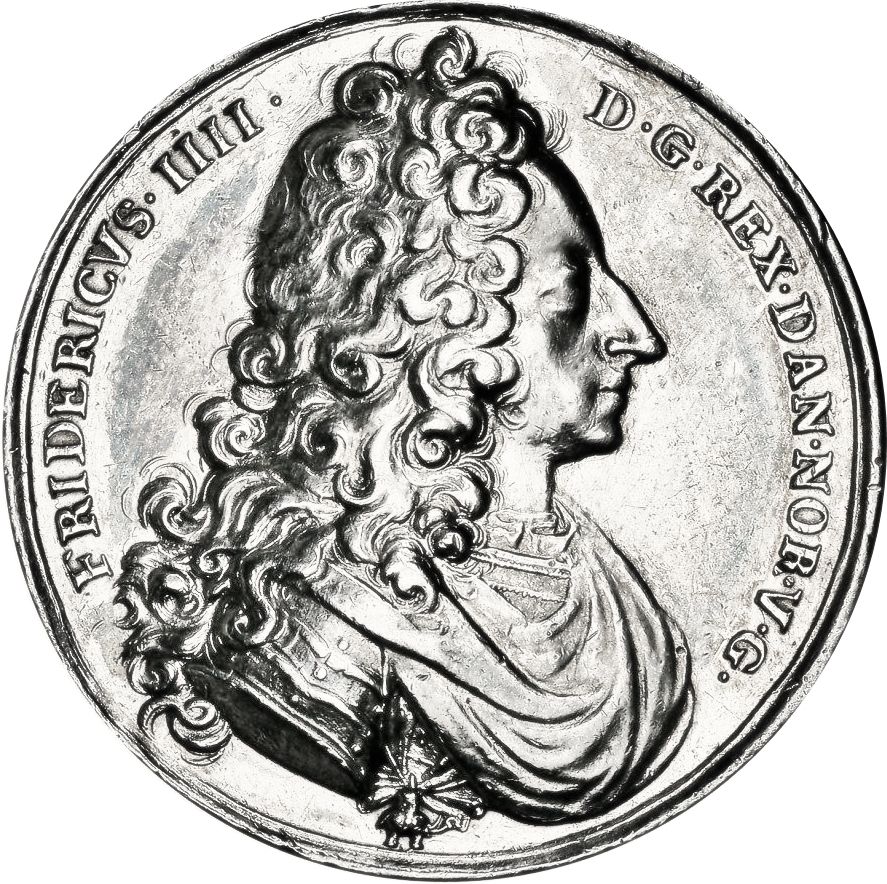 Опис: Бюст короля Фредеріка IV у обладунках та плащі, звернений праворуч, з довгим кучерявим волоссям. Король носить комір з підвіскою Ордена Слона.