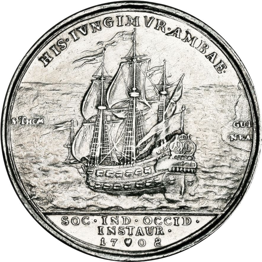 Опис: Озброєне торгове судно, що пливе вліво у відкритому морі під датським прапором; на кормі судна — монограма компанії. Острів Сент-Томас у крайньому лівому куті, Африканська Датська Гінея — праворуч. Дата та напис знизу, в ексергу.