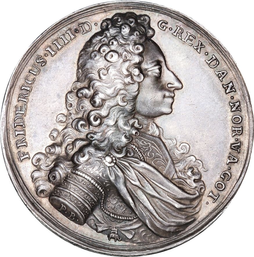 Опис: Бюст короля Фредеріка IV у обладунках та плащі, звернений праворуч, з довгим кучерявим волоссям.