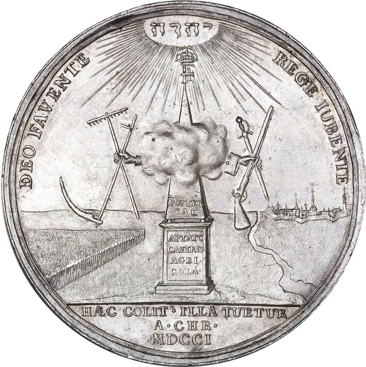 Опис: Високий обеліск із коронованим монограмом короля Фредеріка IV на вершині; два рядки тексту в нижній частині обеліска та чотири на його постаменті. Над вершиною обеліска сяюче ім’я Ісуса на івриті освітлює країну (що означає, що дії короля надихаються Богом); тоді як центральна частина обеліска прихована в хмарах, з яких з обох боків виходить рука. Ліва рука тримає граблі та косу; права рука — меч та рушницю. На задньому плані праворуч зображено укріплене місто, а на передньому плані — пшеничні поля.