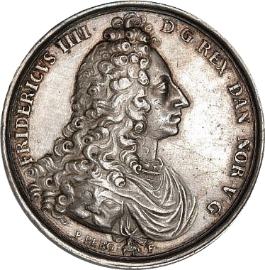 Опис: Бюст короля Фредеріка IV у обладунках та плащі, звернений праворуч, з довгим кучерявим волоссям.