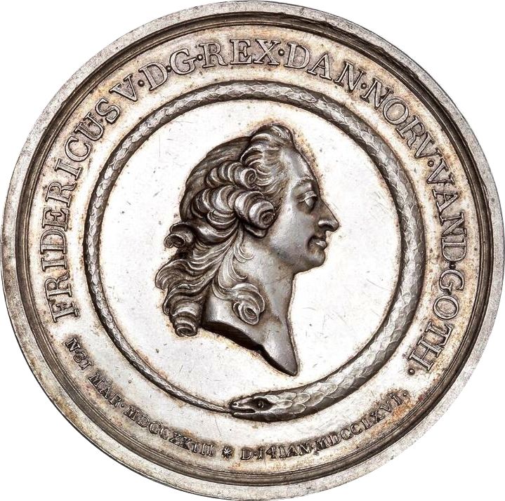 Опис: Голова короля Фредеріка V всередині уробороса (змія в колі, що пожирає власний хвіст: символ нескінченності). Напис зовні з датами народження та смерті короля.