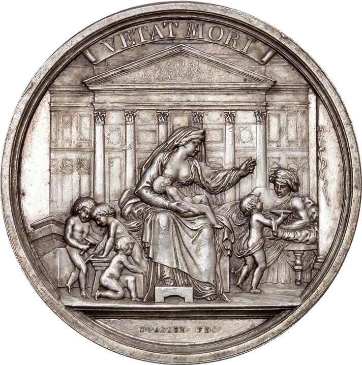 Опис: Скорботна мати з п'ятьма дітьми перед Королівською лікарнею Фредеріка в Копенгагені. Праворуч дитина підносить тарілку лежачому чоловікові. Над будівлею — банер з написом. Ім'я гравера в ексергу.