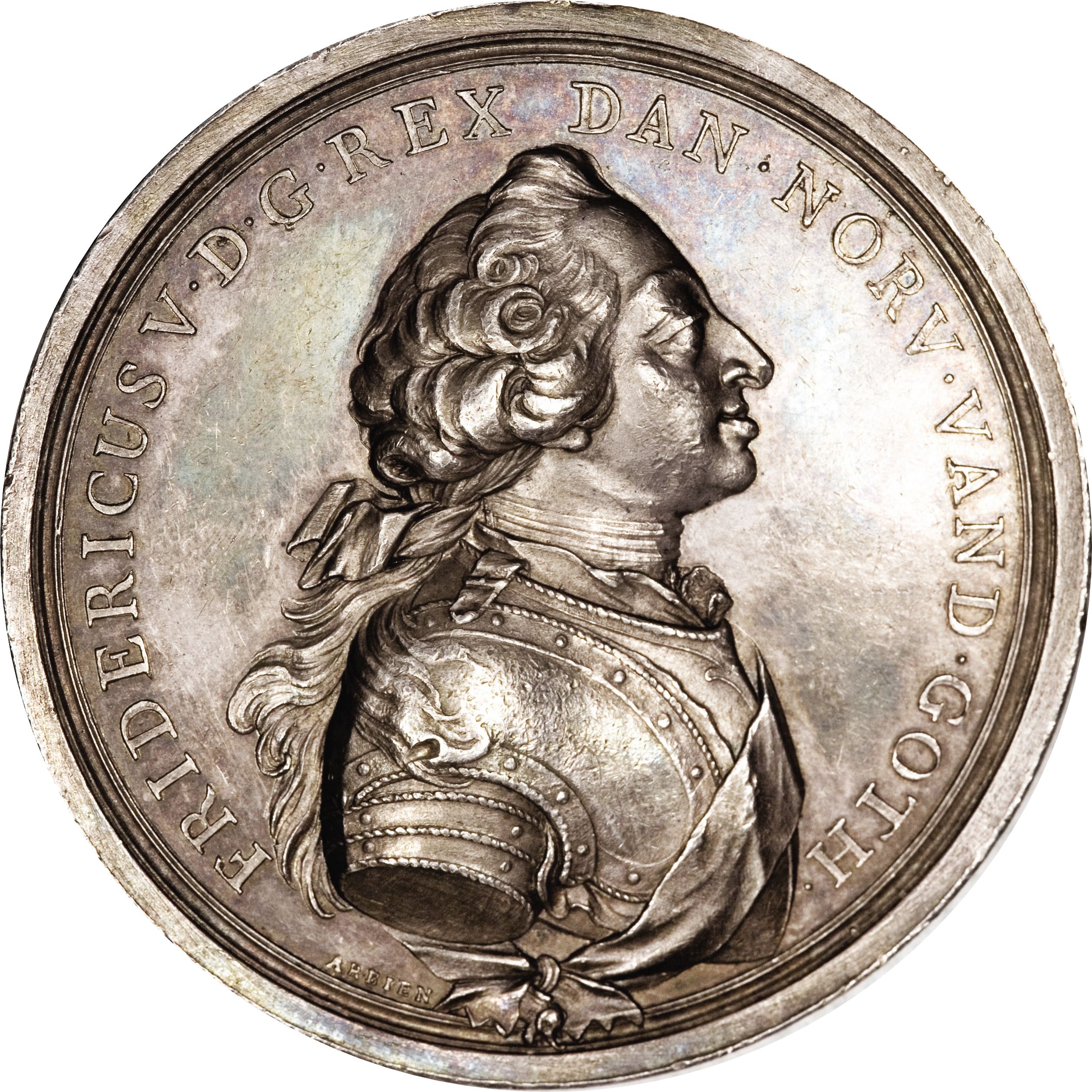 Опис: Броньований бюст короля Фредеріка V з орденом Слона, звернений праворуч. Напис по краю
