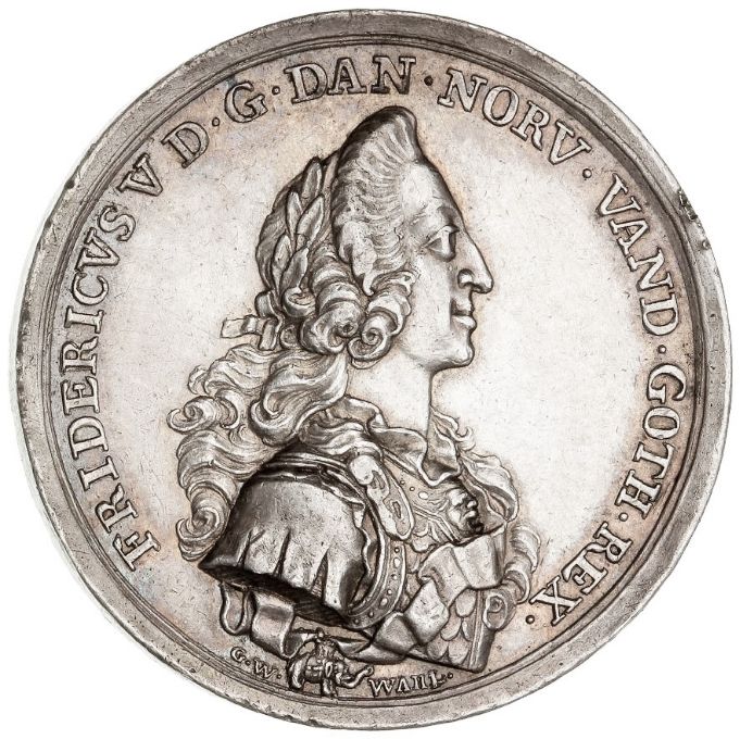 Опис: Бюст короля Фредеріка V у обладунках та з лавровим вінком, обернений праворуч, з нашийною стрічкою та підвіскою Ордена Слона.