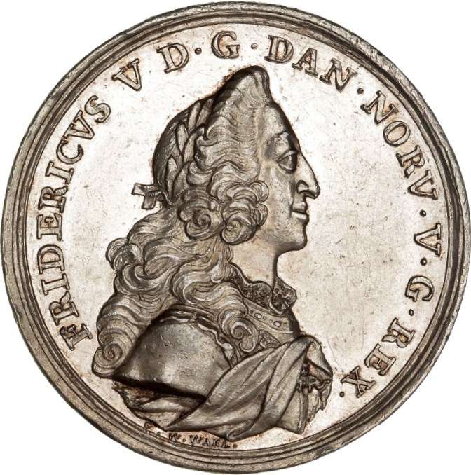 Опис: Покритий мантією та увінчаний лавровим вінком бюст короля Фредеріка V, звернений праворуч, на якому він носить стрічку з підвіскою Ордена Слона.