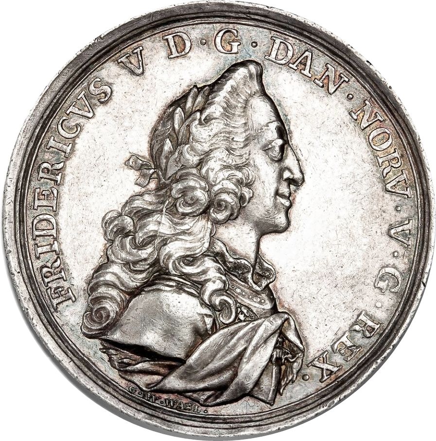 Опис: Погруддя короля Фредеріка V у мантії та лавровому вінку, звернене вправо, з нашийною стрічкою та підвіскою Ордена Слона.