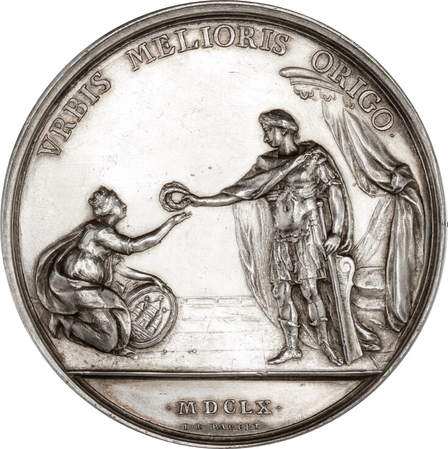 Опис: Король Фредерік III у повній королівській одежі, стоячи під балдахіном, тримає в лівій руці античний скіпетр, а правою рукою вручає корону місту Копенгагену, зображеному у вигляді завуальованої дами, яка стоїть на колінах біля ніг Його Величності. Вона має щит із гербом міста, що лежить зліва від неї, та міську корону на голові.