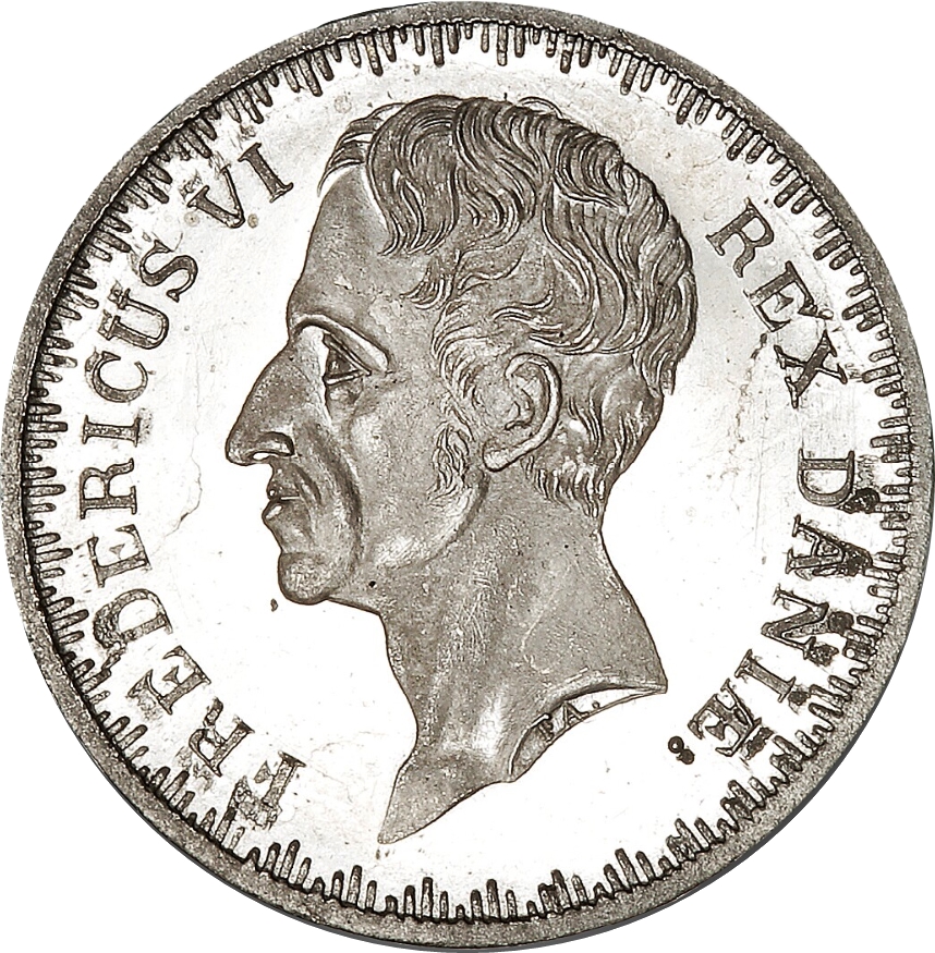 Опис: Голова короля Фредеріка VI, звернена вліво. Ініціали гравера на вирізі на шиї