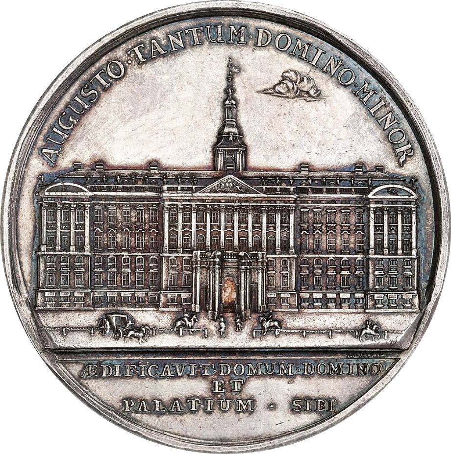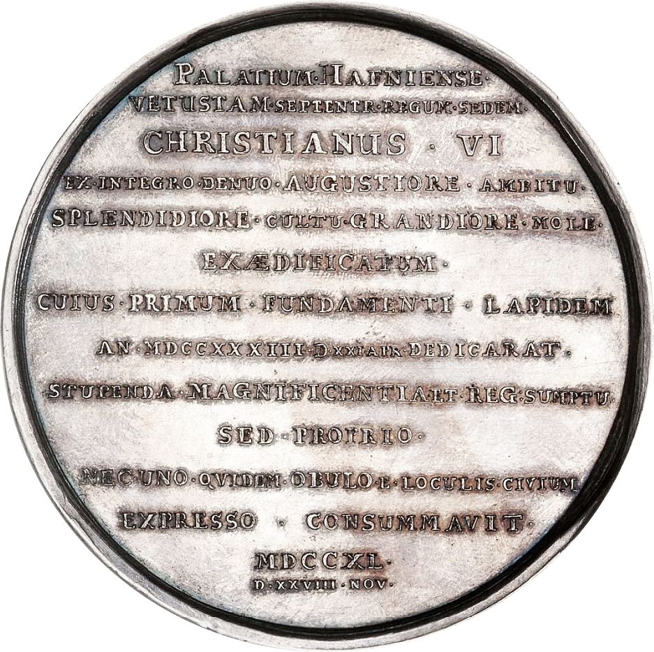 PALATIUM HAFNIENSE VESTUSTAM SEPTENTRionis REGUM SEDEM CHRISTIANUS VI EX INTEGRO DENUO AUGUSTIORE AMBITU SPLENDIDIORE CULTU GRANDIORE MOLE EXÆDIFICATUM CUIUS PRIMUM FUNDAMENTI LADIDEM AN. MDCCXXXIII D. XXI. APR. DEDICABAT STUPENDA MAGNIFICENTIA ET REGIio SUMPTU SED PROPRIO NEC UNO QVIDEM OBULO E LOCULIS CIVIUM EXPRESSO CONSUMMAVIT MDCCXL D. XXVIII