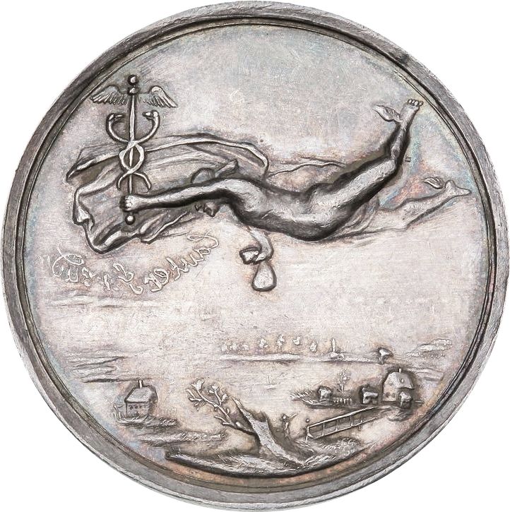 Опис: Гермес/Меркурій (впізнаваний за крилами на ногах) з кадуцеєм у лівій руці летить над морем і сушею, а з його вуст лунає вірш: «lauter freude»