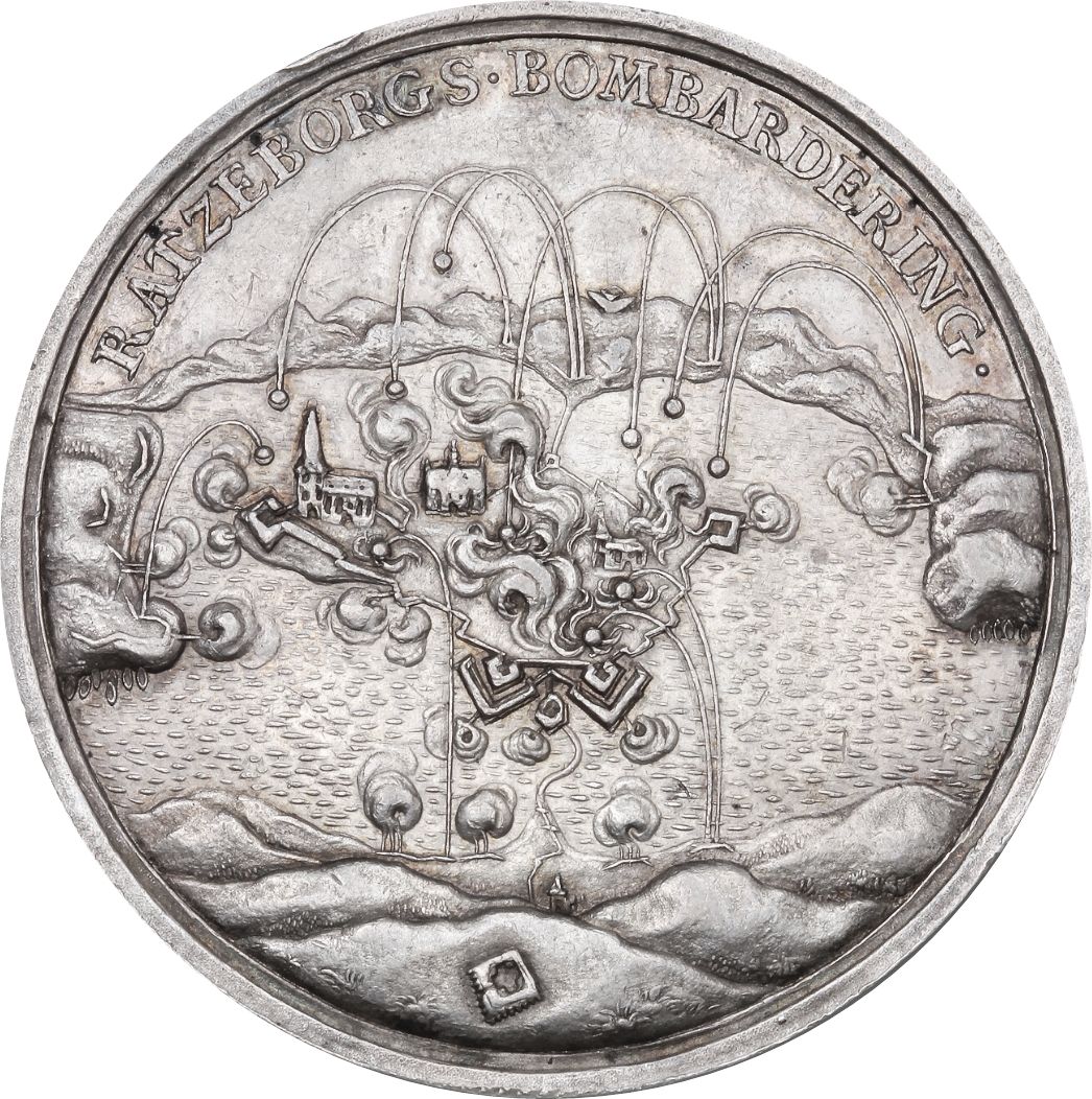Опис: Сцена бомбардування міста Ратцебург. Місто розташоване на острові, частково в руїнах, частково у вогні; тоді як датські батареї знаходяться на берегах навколо міста
