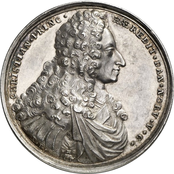 Опис: Покритий мантією бюст кронпринца Крістіана Датського, звернений праворуч, з довгим кучерявим волоссям.