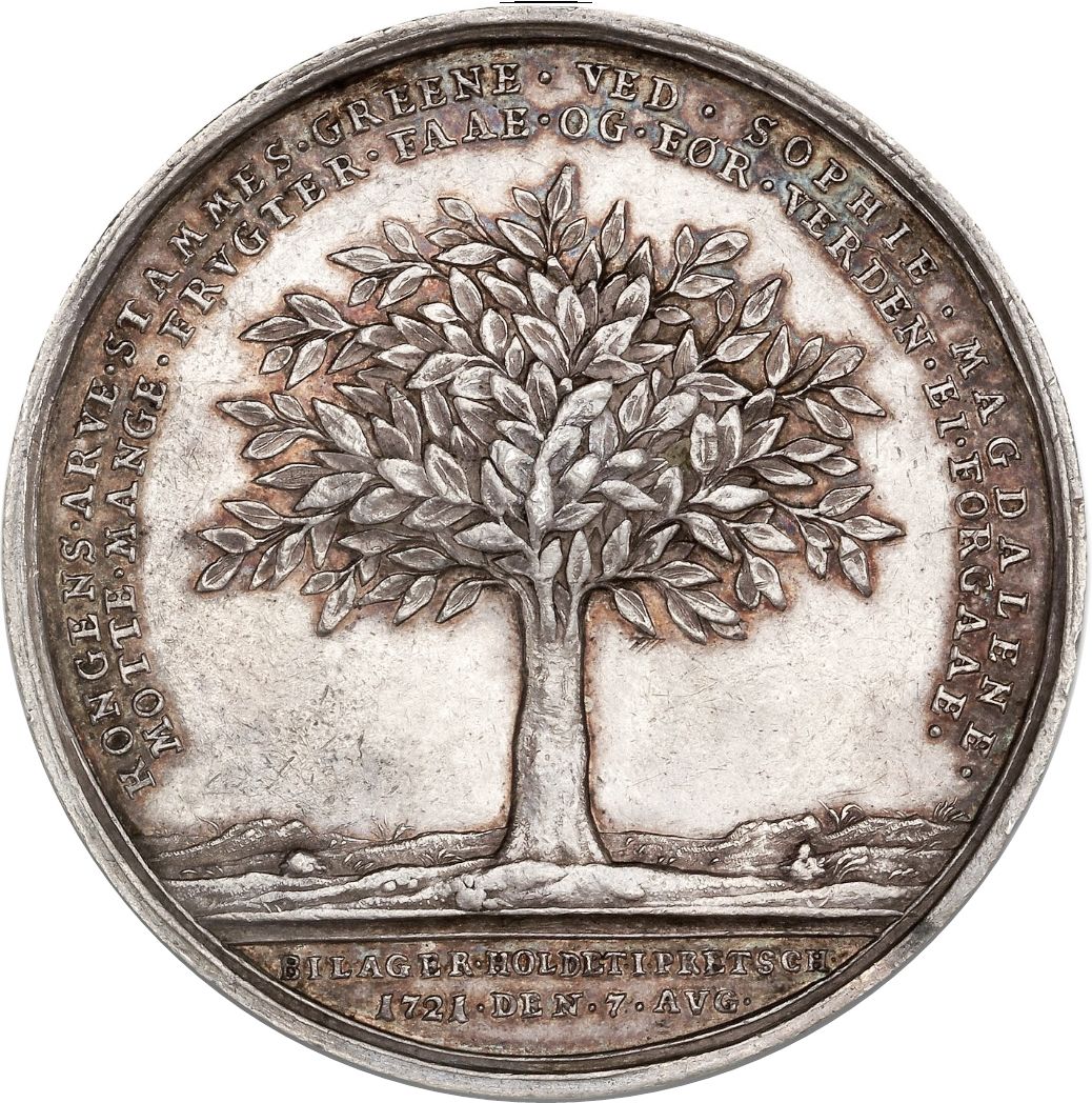Опис: На монеті зображені бюсти кронпринца Крістіана та принцеси Софії Магдалени, обидва у весільних сукнях. Нижче, в ексергу, вказано дату народження та ім’я гравера.