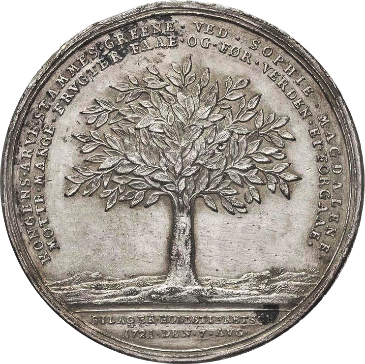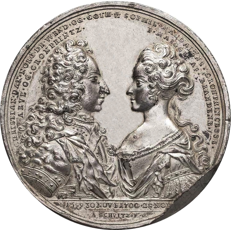 Опис: На монеті зображені бюсти кронпринца Крістіана та принцеси Софії Магдалени, обидва у весільних сукнях. Нижче, в ексергу, вказано дату народження та ім’я гравера.