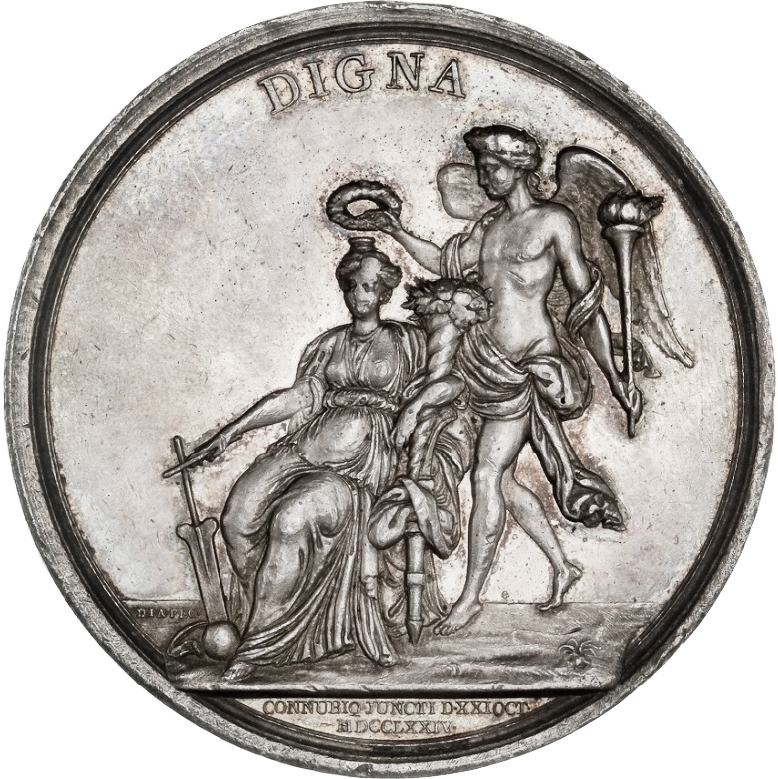 Опис: Богиня Фортуна, тримаючи весла та ріг достатку, сидить ліворуч; за нею — молодий бог Гімен із довгим факелом у лівій руці, який правою рукою тримає лавровий вінок над головою Фортуни.