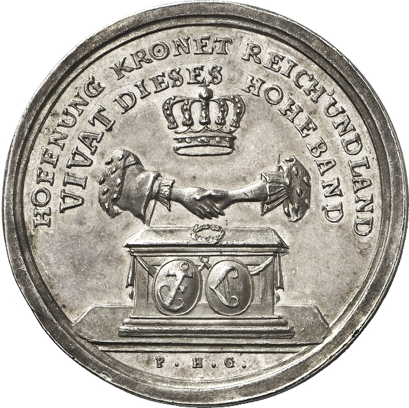 Опис: Дві руки, що стискаються над вівтарем, над яким лежить лавровий вінок; передня частина вівтаря прикрашена двома овальними щитами з монограмами подружжя. Над стиснутими руками зображена корона Данії.