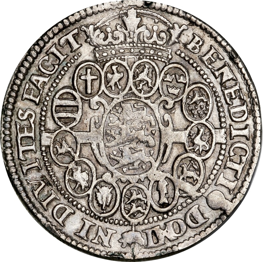 Опис: Коронований напівбюст короля Крістіана IV, звернений вправо, над великим оздобленим картушем з ім'ям і титулами короля. Бюст (але не картуш) знаходиться всередині мотузкового кола, а зовні — девіз короля. Внизу цифри дати розділені лопатями картуша. Монетні знаки знаходяться по боках картуша.