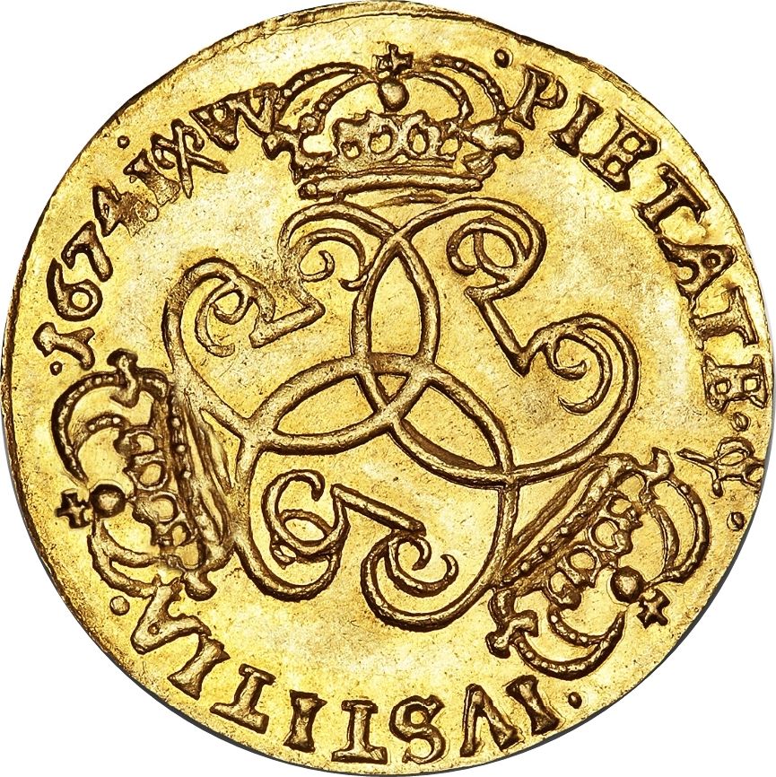 Опис: Три з'єднані монограми короля в трикутній рамці разом із трьома коронами, також у трикутній рамці, але протилежно до першої (так, що кожна корона розміщена між двома сусідніми монограмами). Девіз короля як легенда навколо обідка в трьох сегментах між хрестом корон; дата та знак монетного двору в кінці.