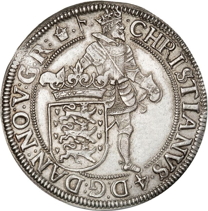 Опис: Коронована стояча фігура короля Крістіана IV у повному обладунку. Його ліва рука лежить на рукоятці меча, а права — на коронованому щиті, що стоїть на землі праворуч від нього. Фігура короля знаходиться всередині кола з написом зовні. Монетний знак у кінці напису.