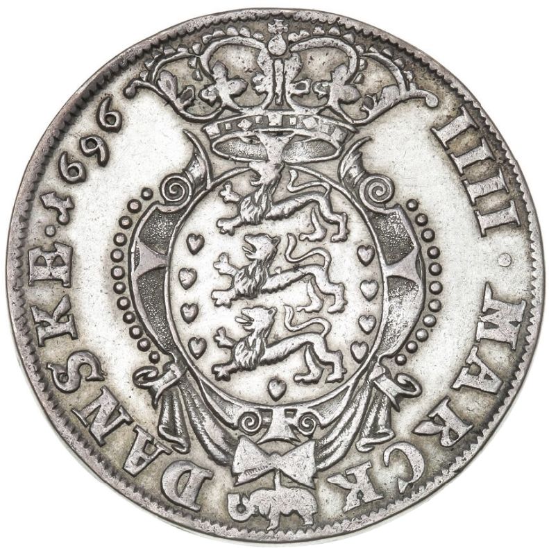 4 марка данська — Крістіан V (тип II; лавровий вінок) 1694 – 1696 Глюкштадт, місто