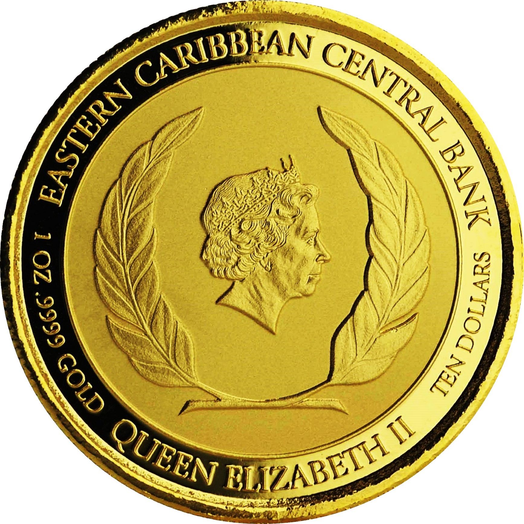 Опис: Портрет Її Величності Королеви Єлизавети II, звернений вправо, в оточенні вінка, напис по колу навколо краю.