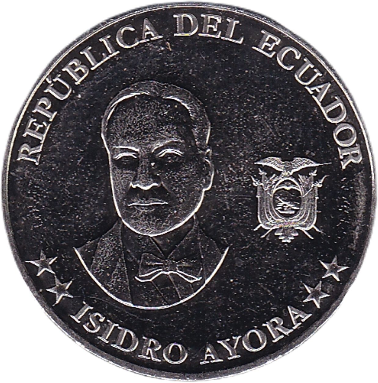 Опис: Назва країни, державний герб, портрет і ім'я колишнього президента Еквадору, лікаря, співака, політика і філософа Ісідро Айора.