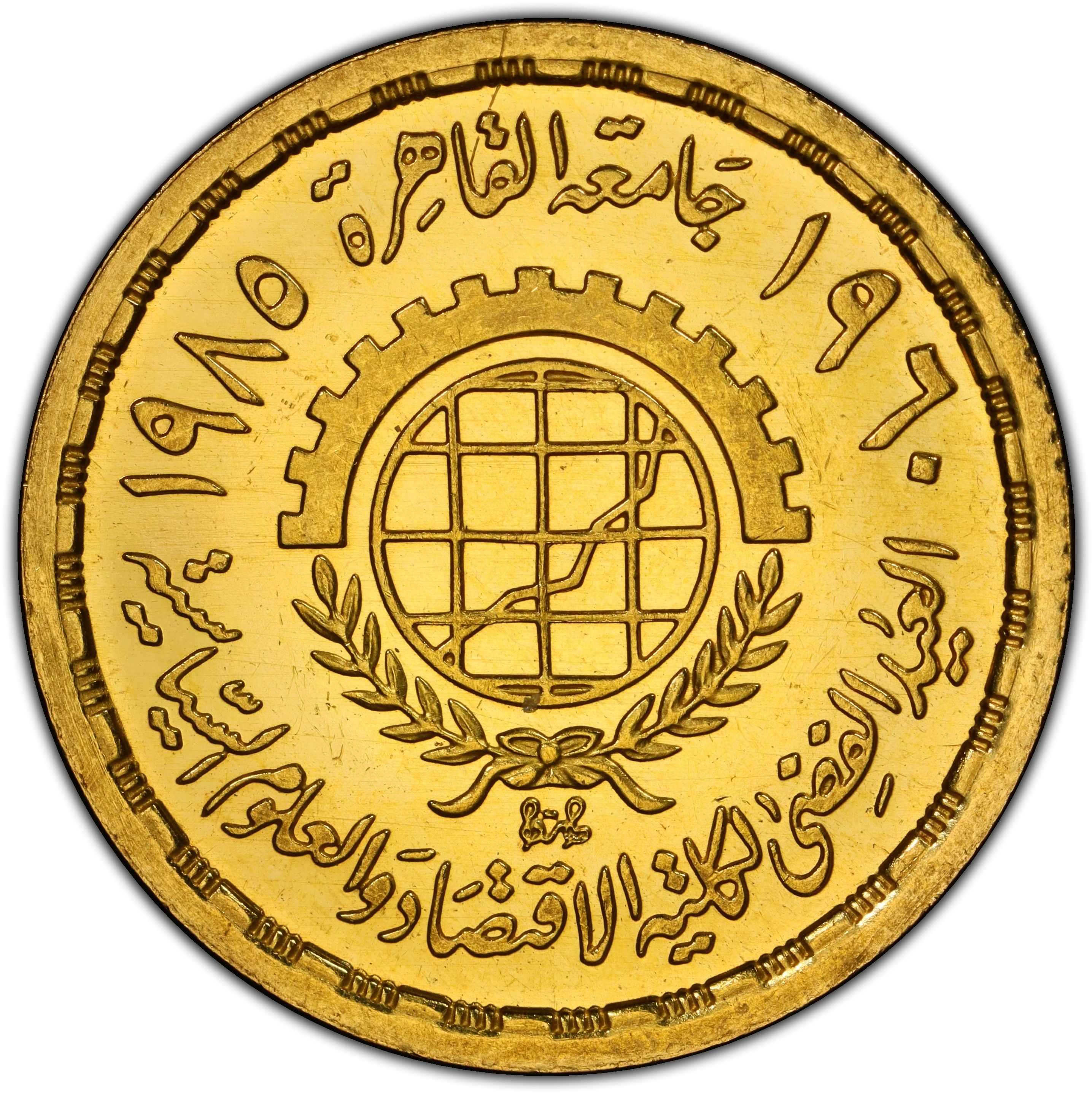 Опис: Центр: Коло з малюнком, оточене наполовину вінком, наполовину шестернею. Окружність: Каїрський університет 1960–1985, факультет економіки та політичних наук, срібний ювілей.