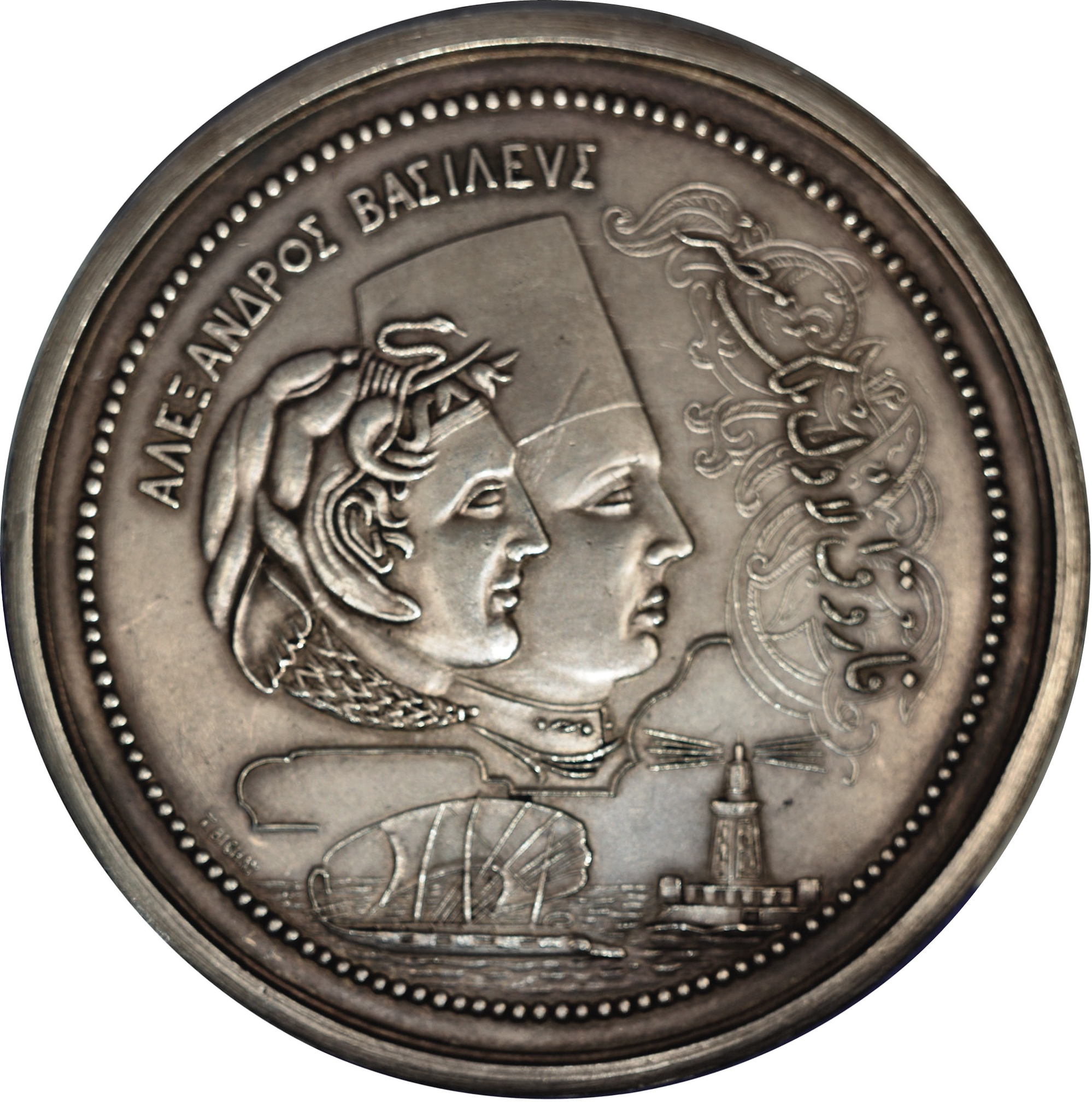 Опис: З'єднані голови короля Фарука та короля Олександра з фінікійським кораблем, що наближається до маяка в Олександрії.