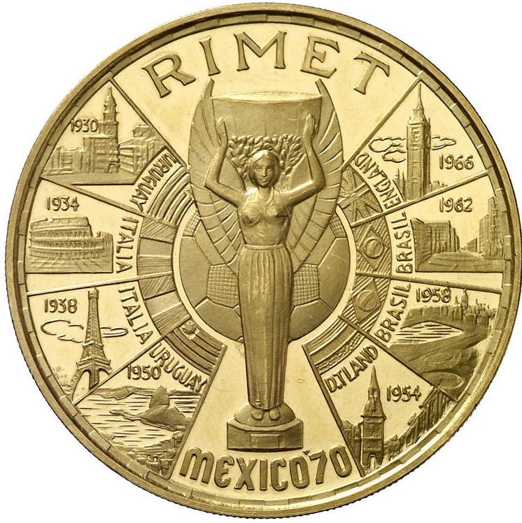 Опис: Трофей Жюля Ріме для чемпіонату світу з футболу FIFA оточений вісьмома секторами, на яких зображено пам'ятки з країн, що приймали вісім попередніх чемпіонатів світу, а також імена переможців і прапори.
