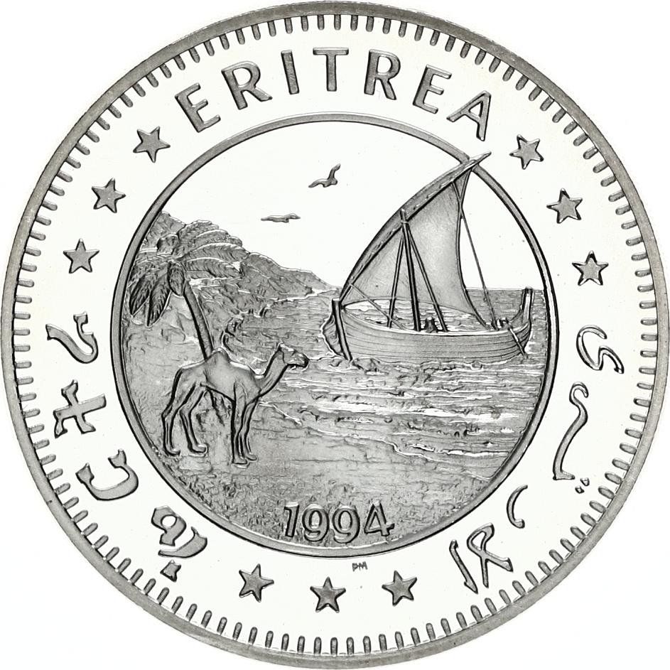 Опис: Пальма, верблюд і дау на морі, в колі. Напис на тигрінья, англійською та арабською мовами навколо зубчастого краю.