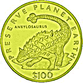 Опис: Анкілозавр, звернений вліво, з піднятим хвостом, номінал внизу.