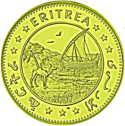 Опис: Пальма, верблюд і дау на морі, у колі. Напис на тигрінья, англійській та арабській мовах навколо зубчастого краю.
