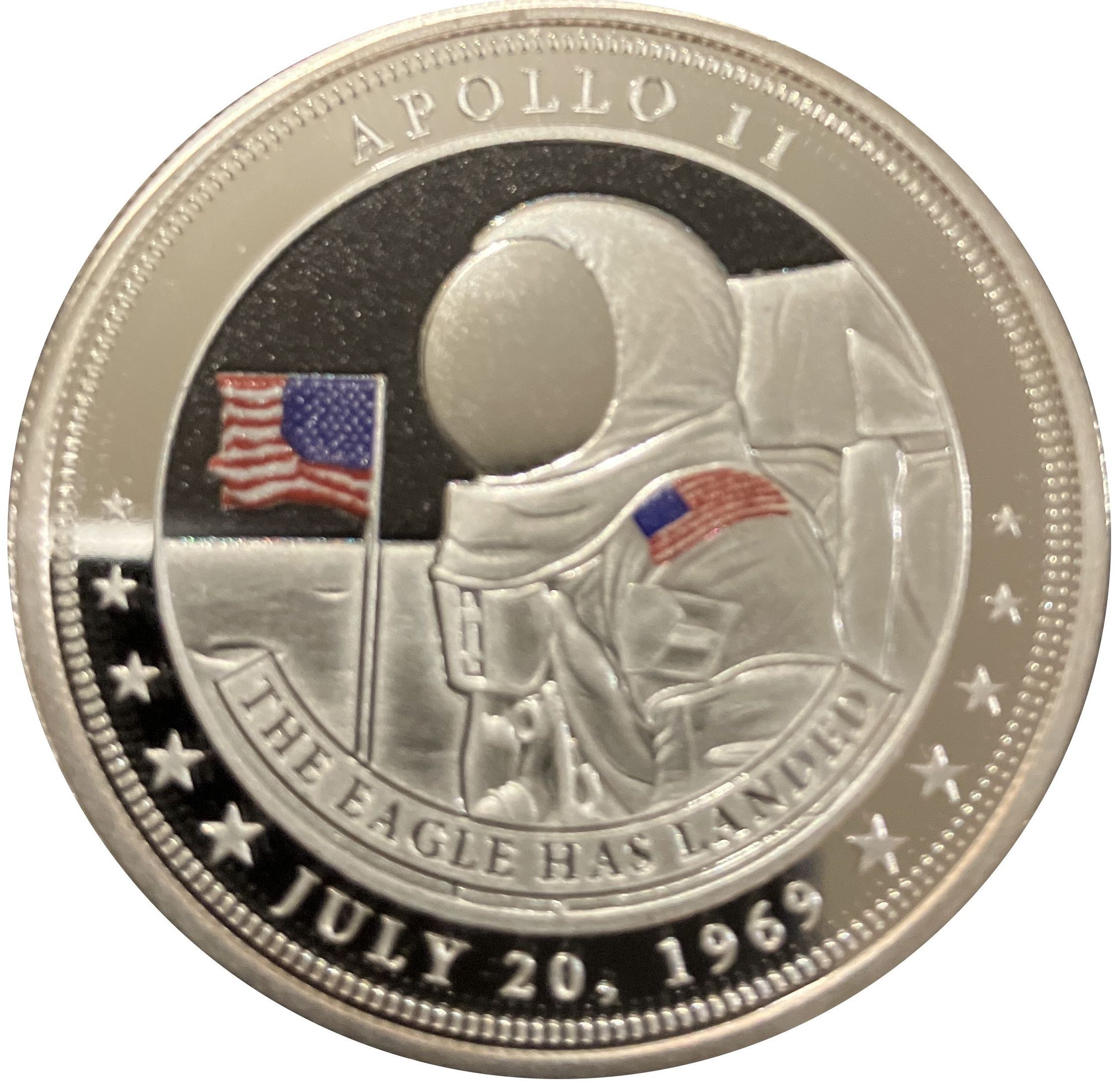 Опис: Космонавт на Місяці з американським прапором на тлі, під яким розміщено банер з написом «THE EAGLE HAS LANDED» (Орел приземлився) та «July 20, 1969» (20 липня 1969 року) нижче. Чорний колір космосу, американський прапор та нашивка на плечі — кольорові.